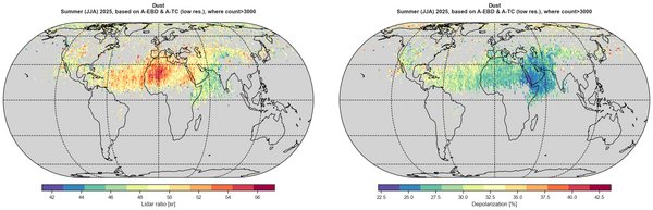 Globale Verteilung der optischen Eigenschaften von Staub, gemessen mit ATLID im Sommer 2025, basierend auf den EarthCARE-Produkten ATL_EBD_2A und ATL_TC__2A. ATLID erkennt das Vorhandensein von Aerosolen mit einer Auflösung von etwa 1 km in horizontaler und 100 m in vertikaler Richtung. Die Farben zeigen das mittlere Depolarisationsverhältnis (links) und das Lidar-Verhältnis (rechts) bei 355 nm für alle 1° × 1° große Längen- und Breitengrad-Gitterzellen, die mehr als 3000 Staubdatenpunkte enthalten.