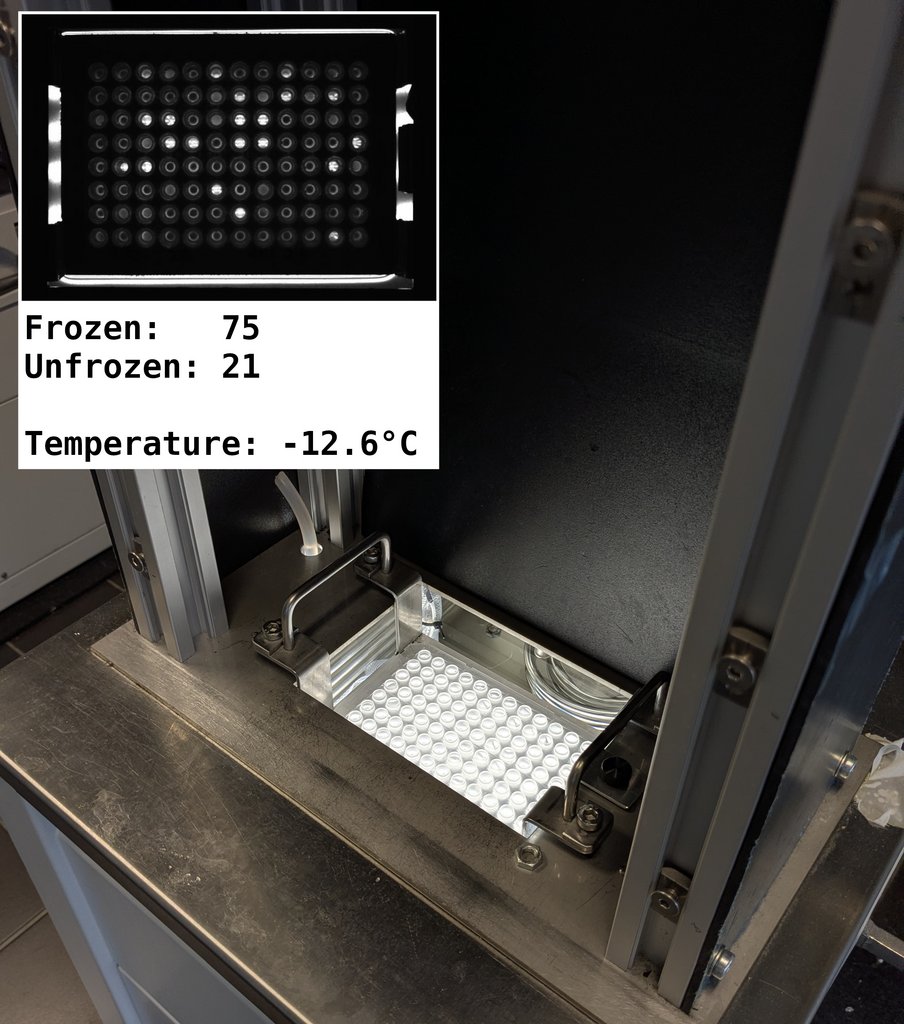 INDA uses standard 96-well PCR plates filled with 50 µL of sample per well. For quartz fiber filter samples, a 1 mm filter punch is immersed directly in pure water in each well. The sealed tray is placed in a bath thermostat and cooled at ~1 K/min, while a camera records the freezing state of each droplet every 0.1 K. As with LINA, frozen and unfrozen droplets are distinguished visually and INP concentration are determined following Vali (1971).The approach is based on Conen et al. (2012), with PCR-tray usage following Hill et al. (2014).