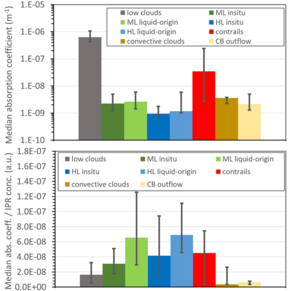 Absoluter und auf die Partikelanzahl normierte Residuengrößenverteilung für verschiedene Wolkentypen. ML und HL bedeuten mittlere Breiten (mid-latitude) bzw. hohe Breiten (high latitude).