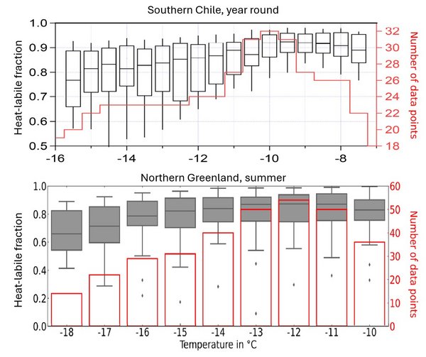 Ein großer Anteil der INPs über alle untersuchten Temperaturen hinweg erwies sich in Südchile und Nordgrönland als wärmelabil (siehe Abbildung unten). Für Südchile gilt dies ganzjährig. In Nordgrönland waren die wärmelabilen Anteile insbesondere im Sommer sehr hoch, doch selbst im Winter konnten sie 50 % überschreiten. In der Antarktis waren die INP-Konzentrationen generell niedrig, und es wurde kein eindeutiges Signal wärmelabiler INPs festgestellt. Dies deutet darauf hin, dass der Antarktis allgemein Quellen für INPs fehlen, insbesondere aus der Biosphäre, wie sie anderswo – sogar in der Arktis – vorhanden sind.