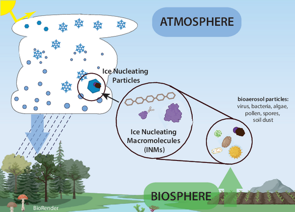 Biologische eisnukleierende Partikel (INPs) katalysieren das Gefrieren von Wassertröpfchen besonders effizient bei Temperaturen knapp unter 0 °C, verändern die Eigenschaften von Mischphasenwolken und tragen somit zur Niederschlagsbildung bei [1]. Eisnukleierende Makromoleküle (INMs) wie spezifische und bislang nicht gut verstandene Proteine oder Polysaccharide [2, 3] spielen in diesem Prozess eine zentrale Rolle.