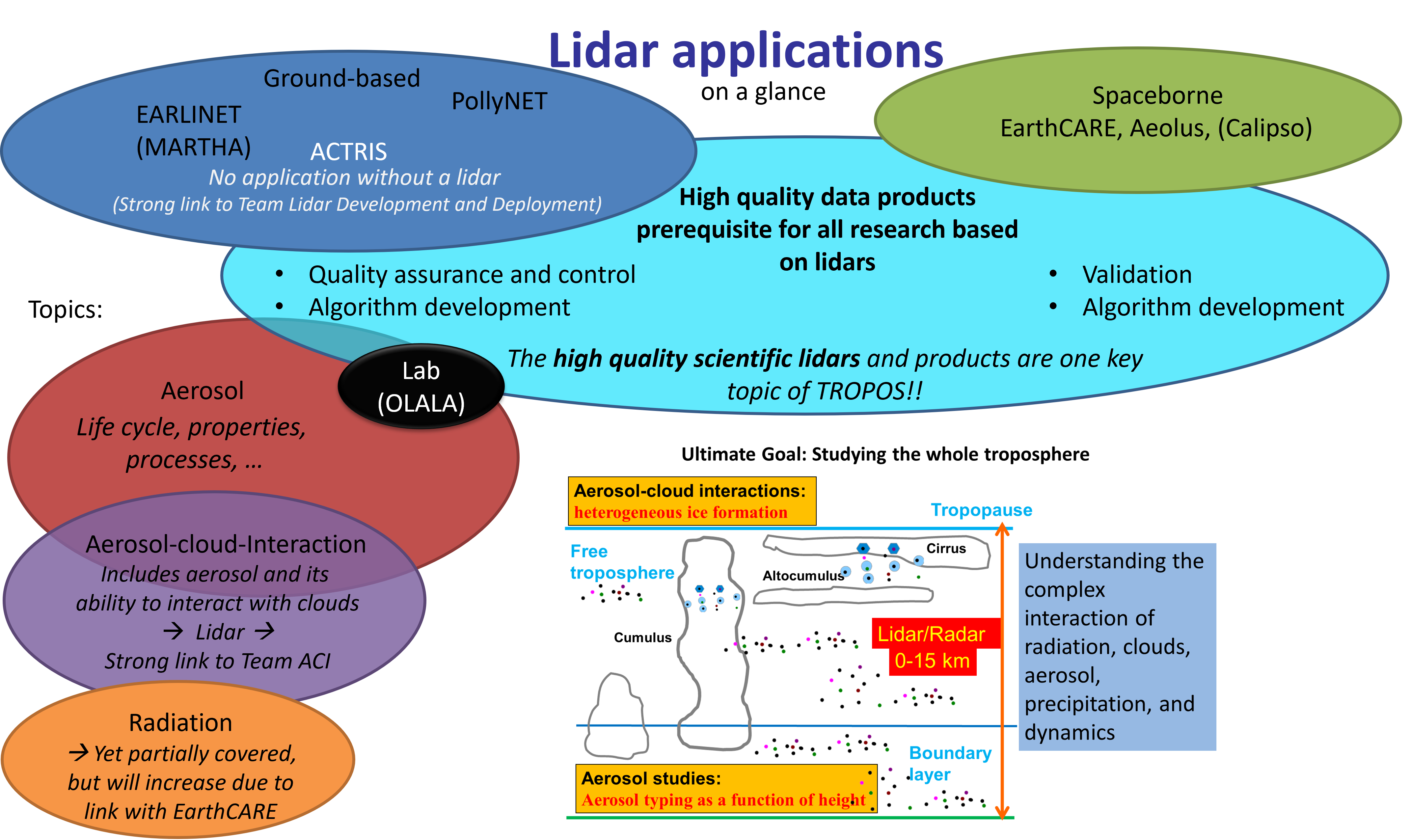 Das Team Lidar-Anwendungen betreibt Forschung auf der Grundlage von Lidar-Daten. Dies umfasst die wissenschaftliche Nutzung von bodengestützten, aber auch weltraumgestützten Lidar-Beobachtungen sowie die Entwicklung von Algorithmen für diese. Zu den aktuellen Arbeitsgebieten des Teams gehören unter anderem: