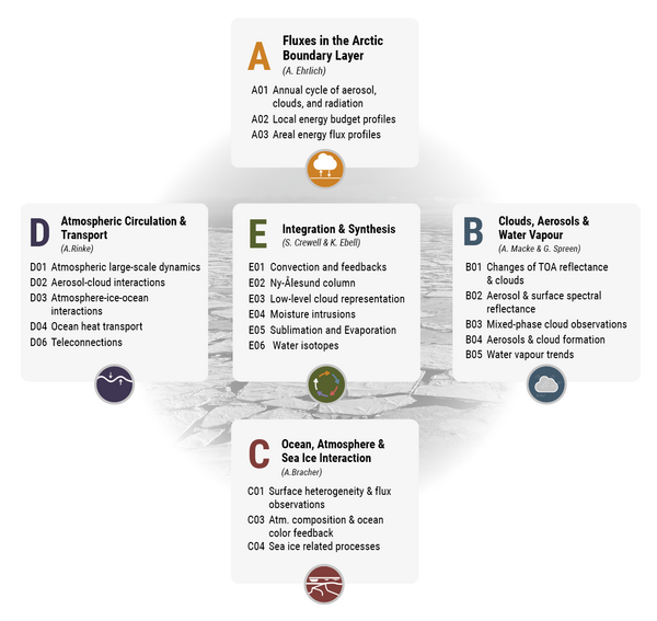 Das Forschungsprojekte ist unterteilt in 5 verschiedene Projektcluster, die unterschiedliche Thematiken die mit dem Phänomen der Arktischen Verstärkung einhergehen, in den Fokus setzen. Diese Cluster sind in Abbildung 1 zu sehen. Um grundlegende und signifikante Fortschritte in unserem Verständnis der arktischen Verstärkung zu erzielen, werden wir die folgenden drei strategischen Fragen (SQs) weiterverfolgen: